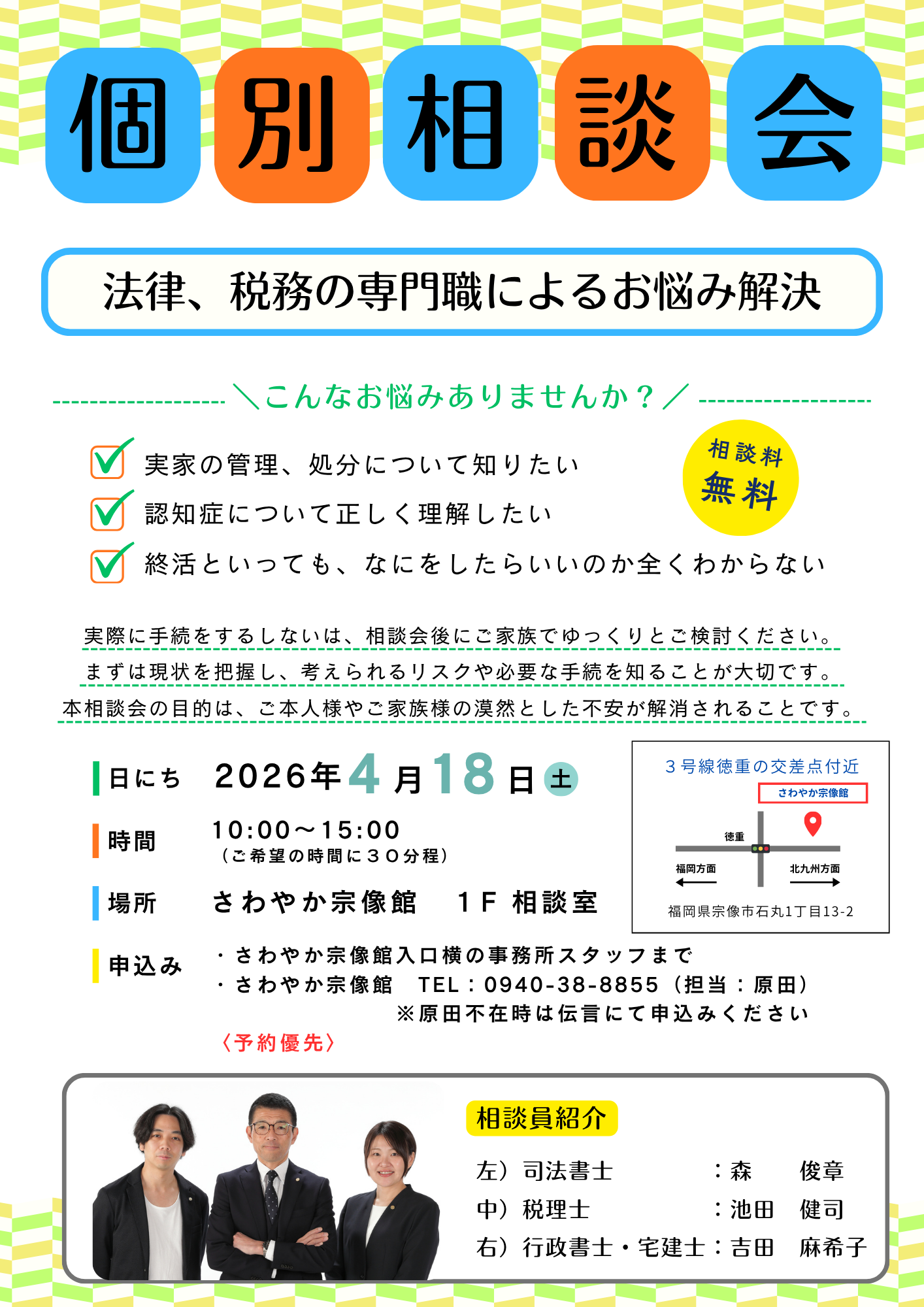 今週の土曜日に、さわやか宗像館にて、相談会を開催します!